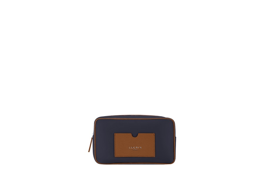 Toalettilaukku nailonia + nahkaa (19,5 x 12,5 x 7,5 cm) - Kellanruskea-Laivastonsininen - Kangas