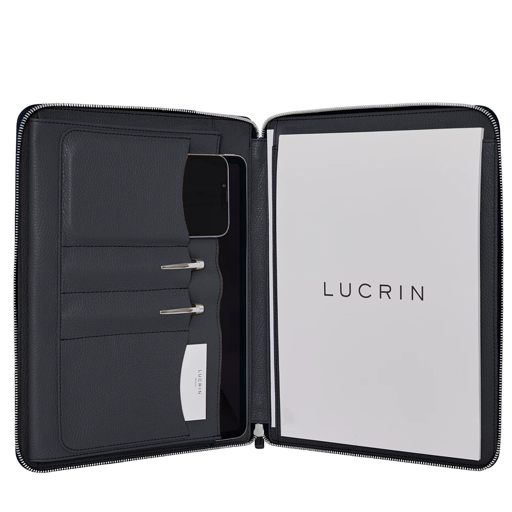 Tämä on valikoimamme erilaisten A4-kansioiden ylellinen versio. L5-mallistoon kuuluva tyylikäs kansio valmistetaan laadukkaasta aidosta nahasta ja omaa upeita ominaisuuksia, joiden avulla tavarasi pysyvät järjestyksessä ja turvasa. A4-kokoinen asiakirjakansio matkoille suljetaan luotettavalla YKK-vetoketjulla, joka takaa kaiken pysyvän visusti sisällä - mahtava lisä ollessasi matkoilla tai muuten liikkeellä. Nahkaisen asiakirjakansion sisäpuolelle on suunniteltu näppäriä lokeroita ja taskuja, joihin mahtuu esimerkiksi iPad, älypuhelin, kyniä, A4-lehtiö ja muita asiakirjoja.